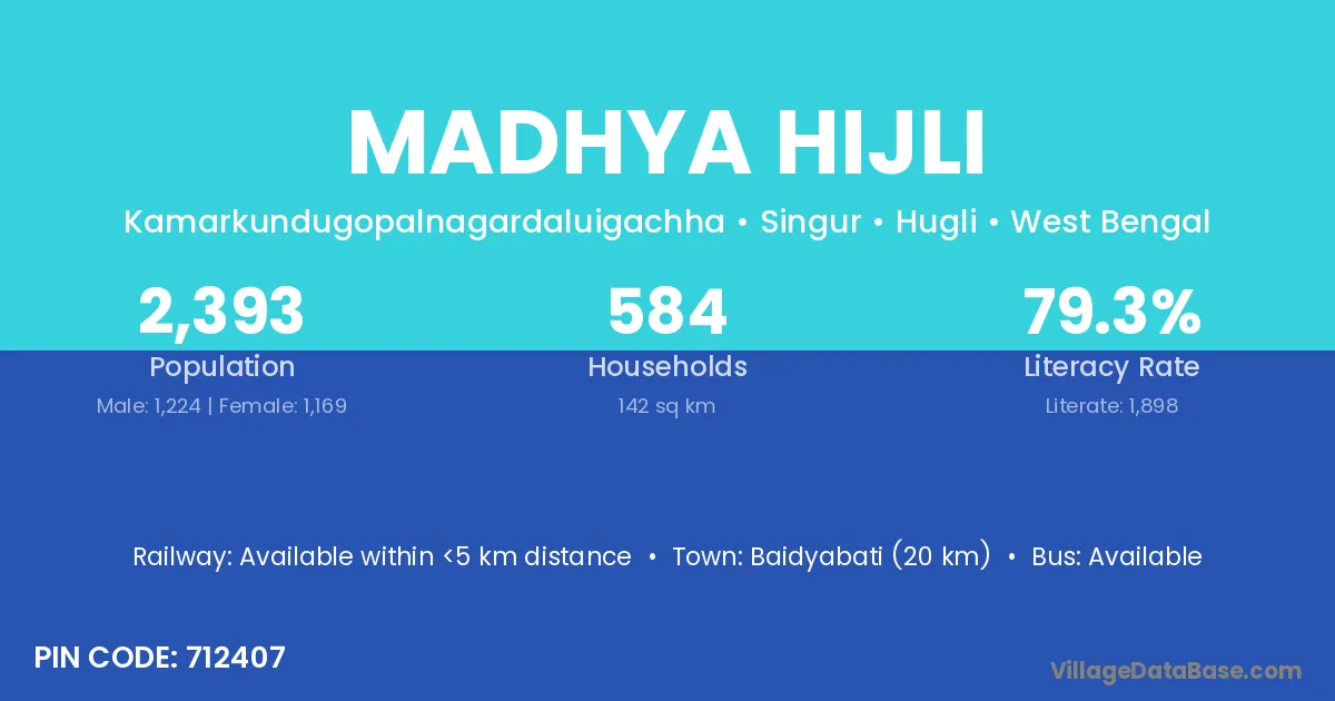 Baidyabati (20 km) is the nearest town to Madhya Hijli village for major economic activities and is located approximately 20 km away.