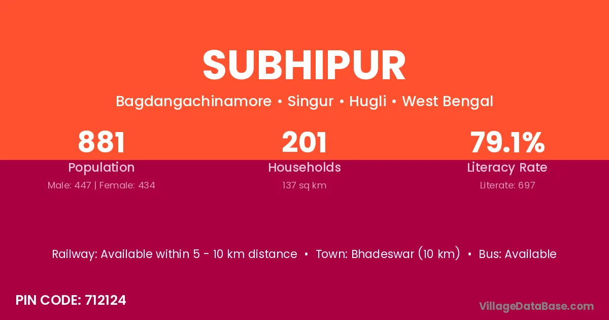 Bhadeswar (10 km) is the nearest town to Subhipur village for major economic activities and is located approximately 10 km away.