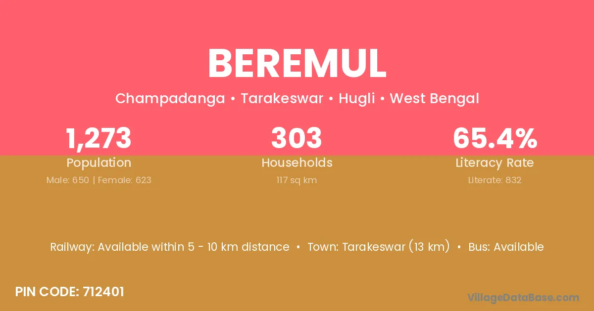 Tarakeswar (13 km) is the nearest town to Beremul village for major economic activities and is located approximately 13 km away.