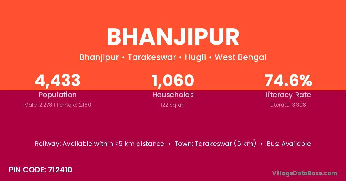 Tarakeswar (5 km) is the nearest town to Bhanjipur village for major economic activities and is located approximately 5 km away.
