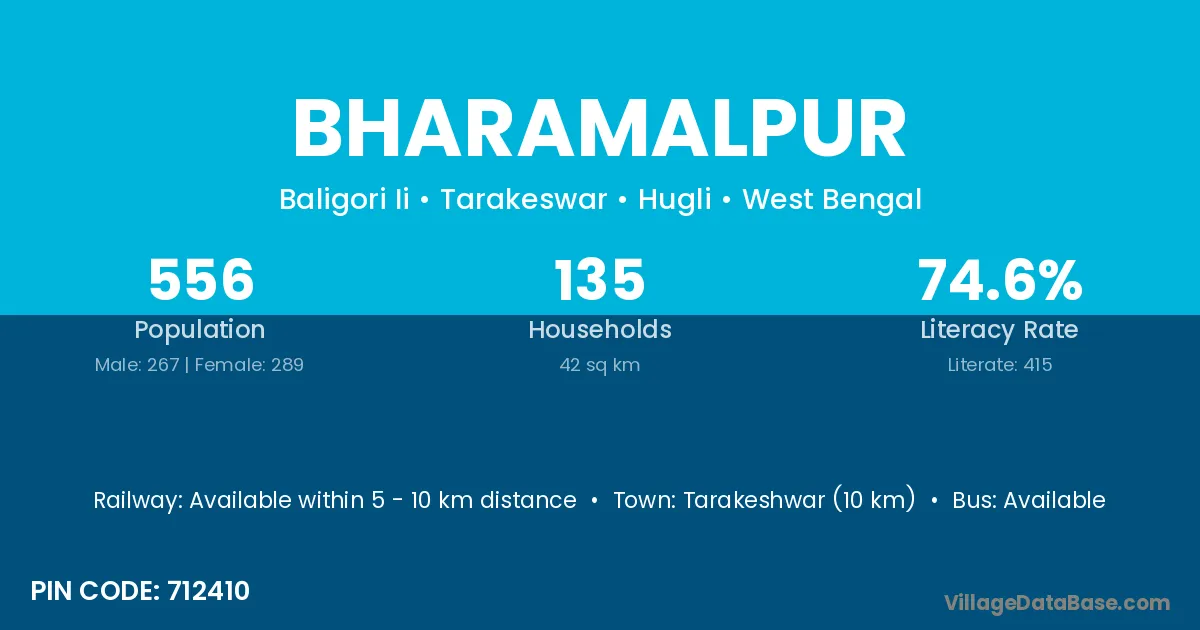Tarakeshwar (10 km) is the nearest town to Bharamalpur village for major economic activities and is located approximately 10 km away.