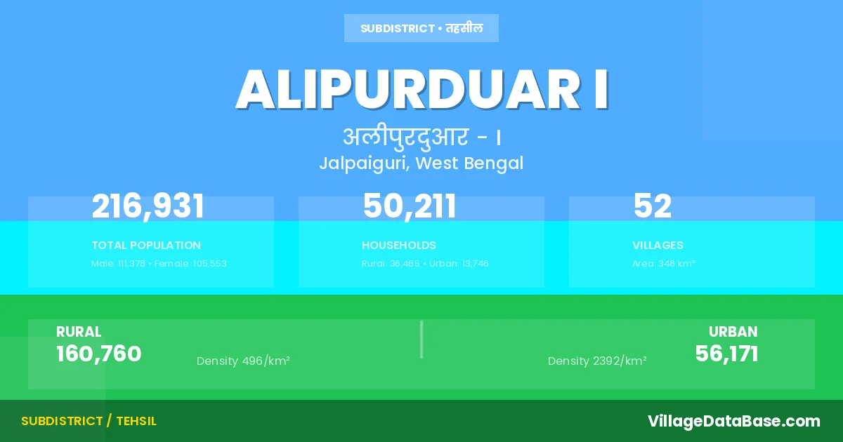According to the 2011 census The total area of Alipurduar I Subdivision is 348 km², with a population of 216931 people. The population density is 624 inhabitants per square kilometre, and there are approximately 50211 houses in the sub district.