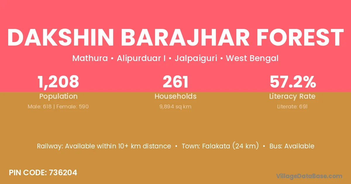 Falakata (24 km) is the nearest town to Dakshin Barajhar Forest village for major economic activities and is located approximately 24 km away.