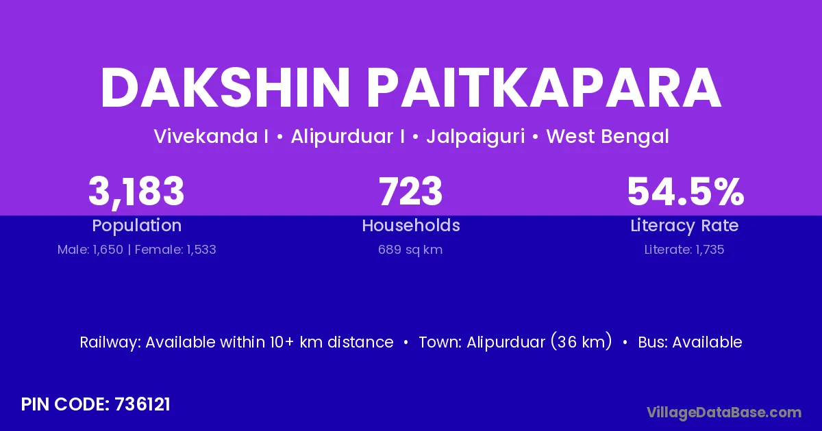 Alipurduar (36 km) is the nearest town to Dakshin Paitkapara village for major economic activities and is located approximately 36 km away.