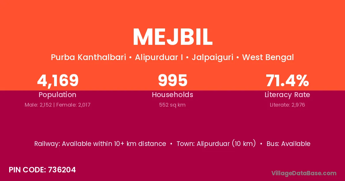 Alipurduar (10 km) is the nearest town to Mejbil village for major economic activities and is located approximately 10 km away.