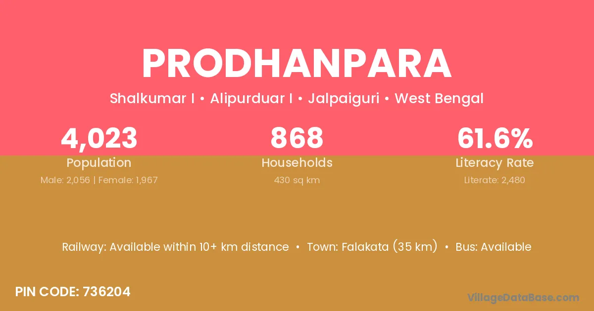 Falakata (35 km) is the nearest town to Prodhanpara village for major economic activities and is located approximately 35 km away.