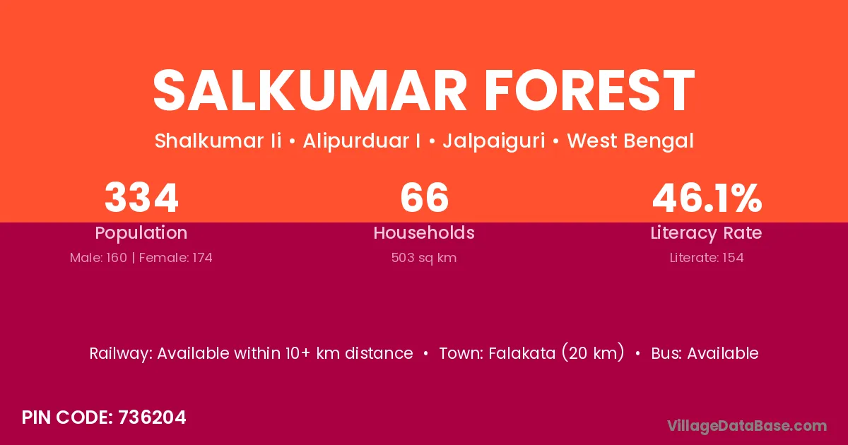 Falakata (20 km) is the nearest town to Salkumar Forest village for major economic activities and is located approximately 20 km away.