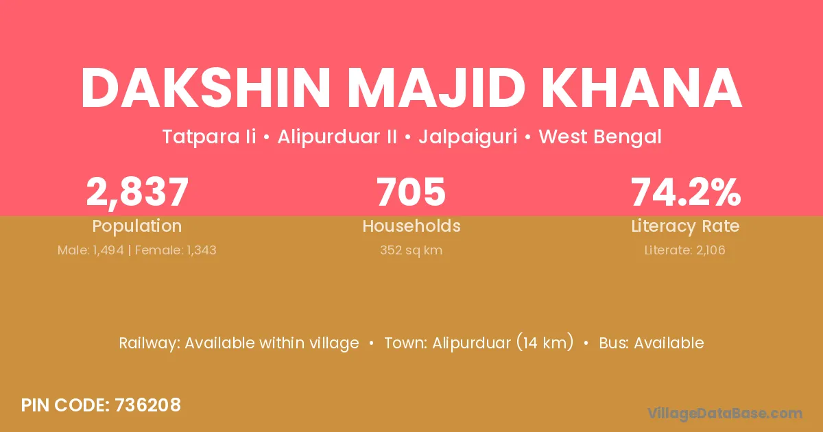 Alipurduar (14 km) is the nearest town to Dakshin Majid Khana village for major economic activities and is located approximately 14 km away.