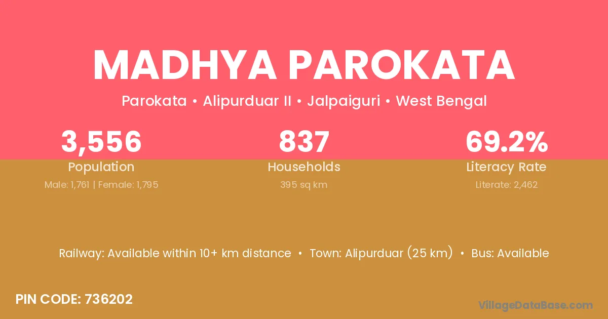 Alipurduar (25 km) is the nearest town to Madhya Parokata village for major economic activities and is located approximately 25 km away.