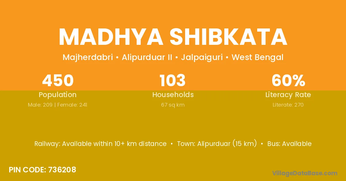 Alipurduar (15 km) is the nearest town to Madhya Shibkata village for major economic activities and is located approximately 15 km away.