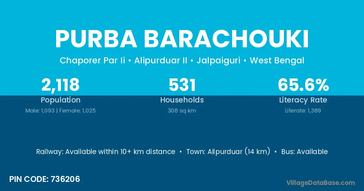 Alipurduar (14 km) is the nearest town to Purba Barachouki village for major economic activities and is located approximately 14 km away.