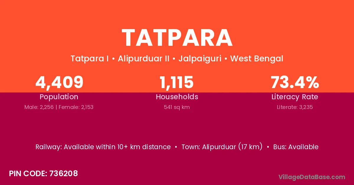 Alipurduar (17 km) is the nearest town to Tatpara village for major economic activities and is located approximately 17 km away.