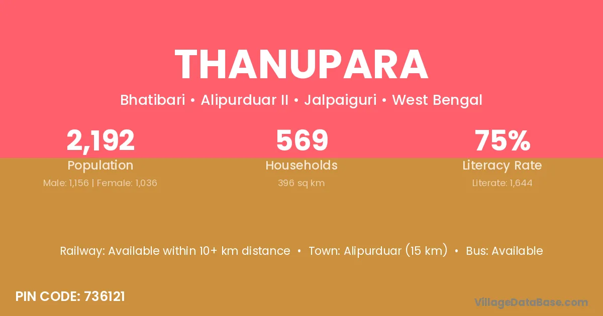 Alipurduar (15 km) is the nearest town to Thanupara village for major economic activities and is located approximately 15 km away.