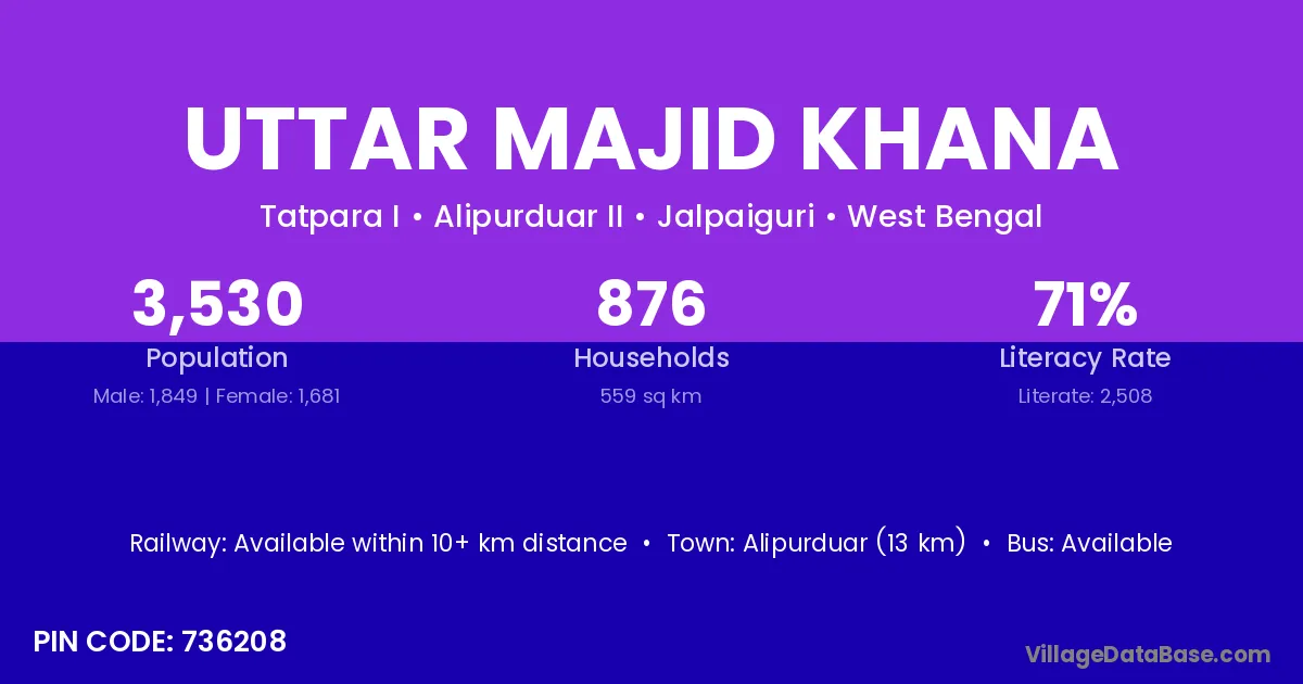 Alipurduar (13 km) is the nearest town to Uttar Majid Khana village for major economic activities and is located approximately 13 km away.