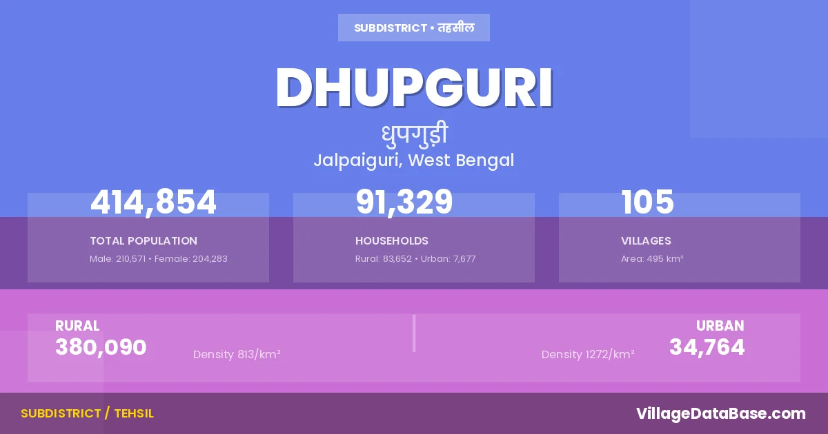 According to the 2011 census The total area of Dhupguri Subdivision is 495 km², with a population of 414854 people. The population density is 838 inhabitants per square kilometre, and there are approximately 91329 houses in the sub district.