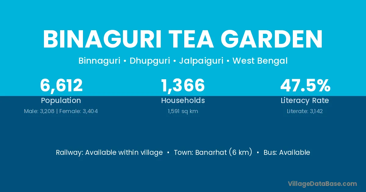 Banarhat (6 km) is the nearest town to Binaguri Tea Garden village for major economic activities and is located approximately 6 km away.