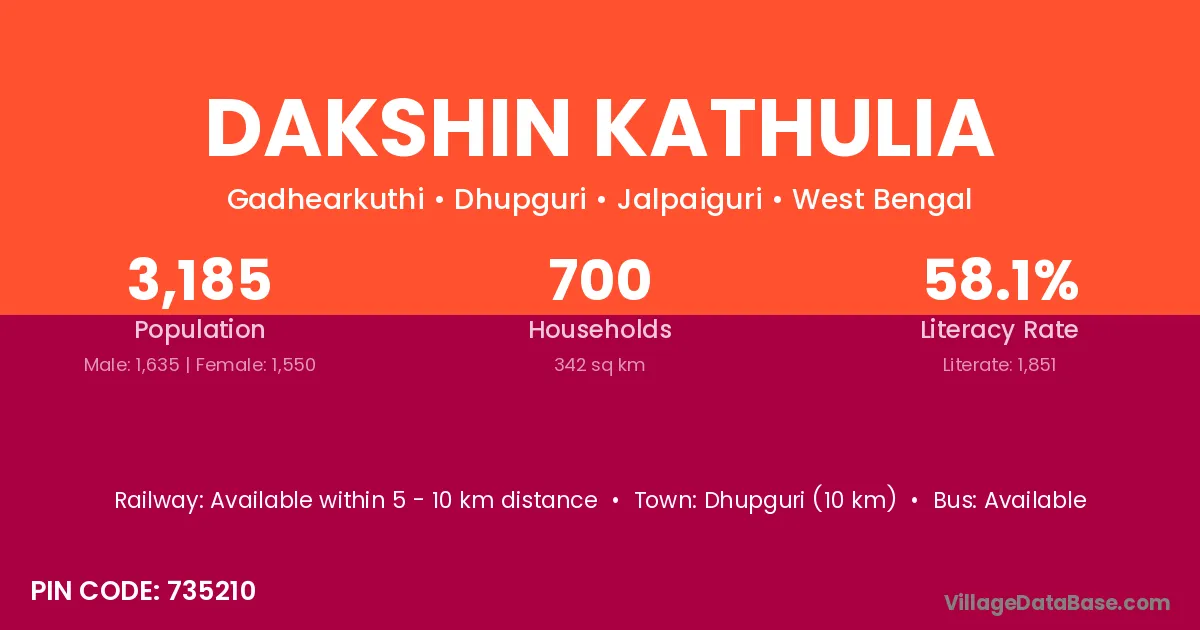 Dhupguri (10 km) is the nearest town to Dakshin Kathulia village for major economic activities and is located approximately 10 km away.