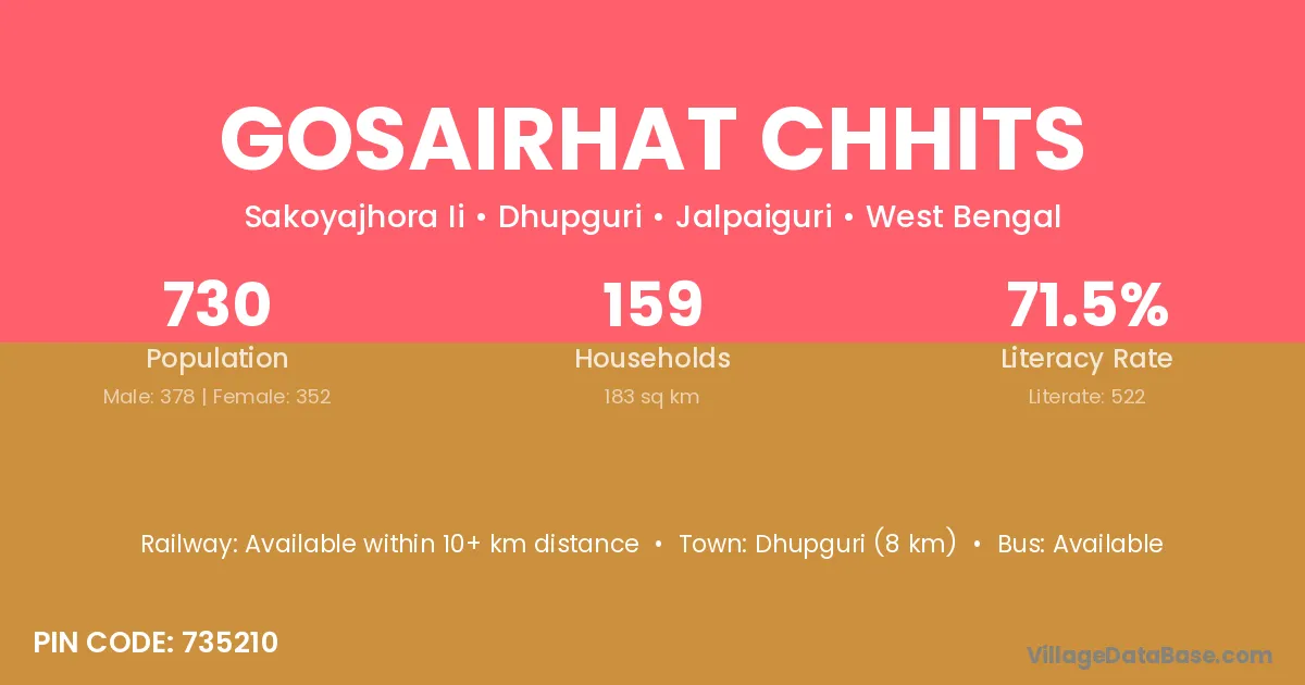 Dhupguri (8 km) is the nearest town to Gosairhat Chhits village for major economic activities and is located approximately 8 km away.