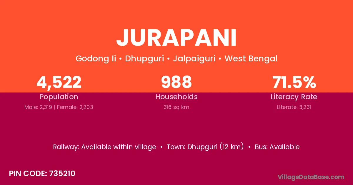 Dhupguri (12 km) is the nearest town to Jurapani village for major economic activities and is located approximately 12 km away.