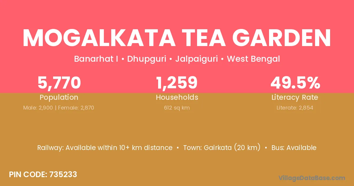 Mogalkata Tea Garden village has a total population of 5,770 people, of which 2,900 are males and 2,870 are females.