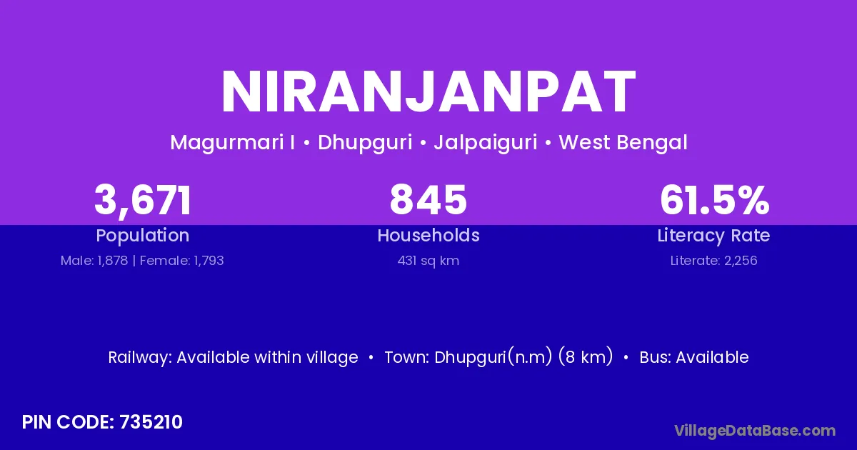 Dhupguri(n.m) (8 km) is the nearest town to Niranjanpat village for major economic activities and is located approximately 8 km away.