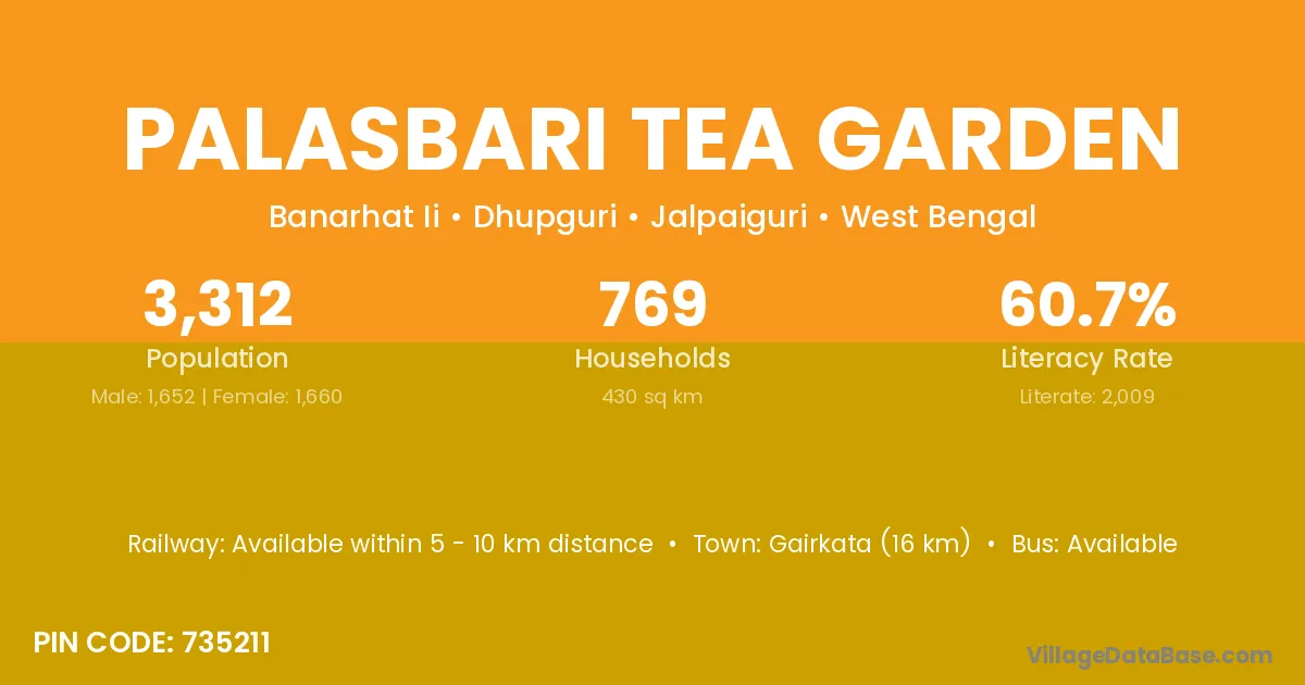 Palasbari Tea Garden village has a total population of 3,312 people, of which 1,652 are males and 1,660 are females.
