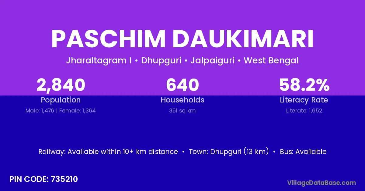 Dhupguri (13 km) is the nearest town to Paschim Daukimari village for major economic activities and is located approximately 13 km away.