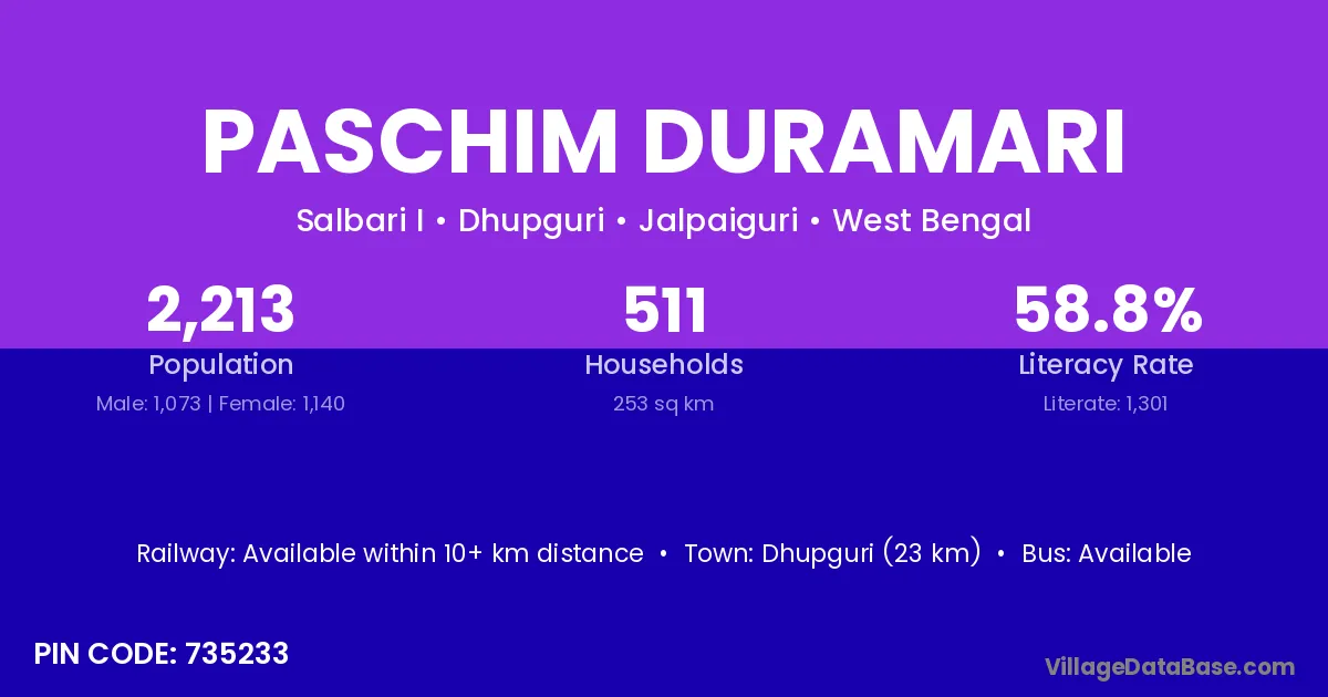 Dhupguri (23 km) is the nearest town to Paschim Duramari village for major economic activities and is located approximately 23 km away.
