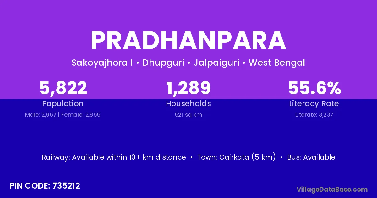Gairkata (5 km) is the nearest town to Pradhanpara village for major economic activities and is located approximately 5 km away.