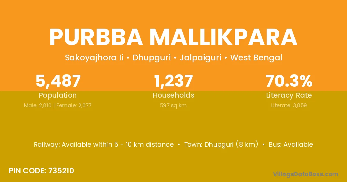 Dhupguri (8 km) is the nearest town to Purbba Mallikpara village for major economic activities and is located approximately 8 km away.