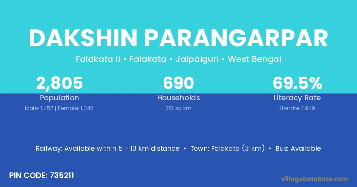 Falakata (3 km) is the nearest town to Dakshin Parangarpar village for major economic activities and is located approximately 3 km away.