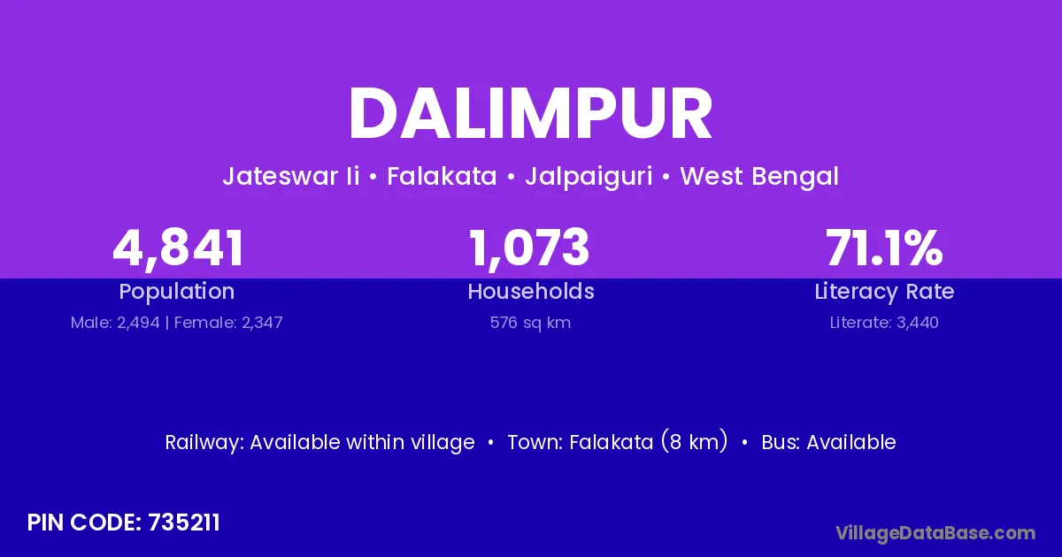 Falakata (8 km) is the nearest town to Dalimpur village for major economic activities and is located approximately 8 km away.