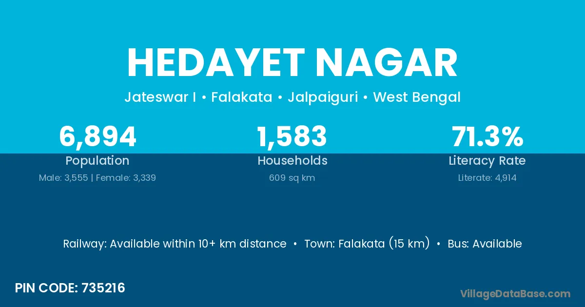Falakata (15 km) is the nearest town to Hedayet Nagar village for major economic activities and is located approximately 15 km away.