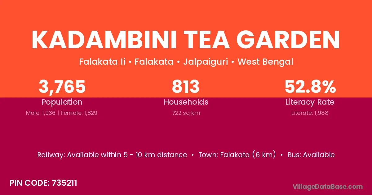 Falakata (6 km) is the nearest town to Kadambini Tea Garden village for major economic activities and is located approximately 6 km away.