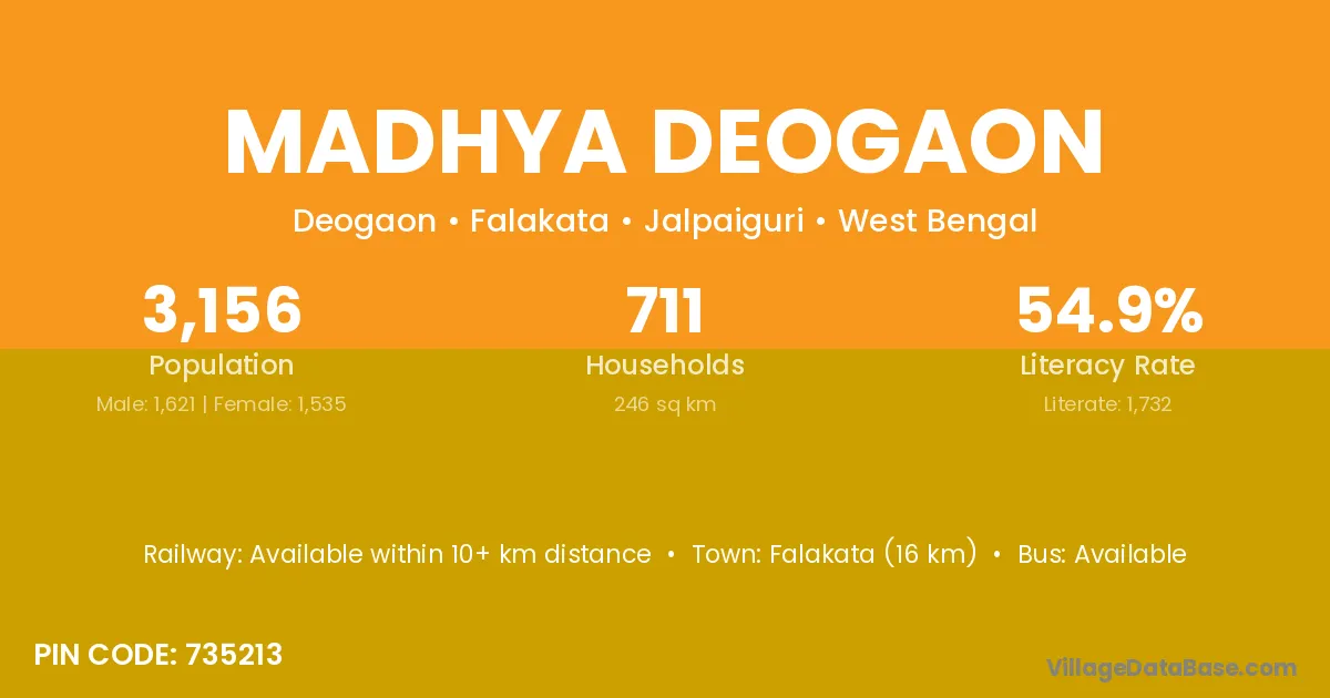 Falakata (16 km) is the nearest town to Madhya Deogaon village for major economic activities and is located approximately 16 km away.