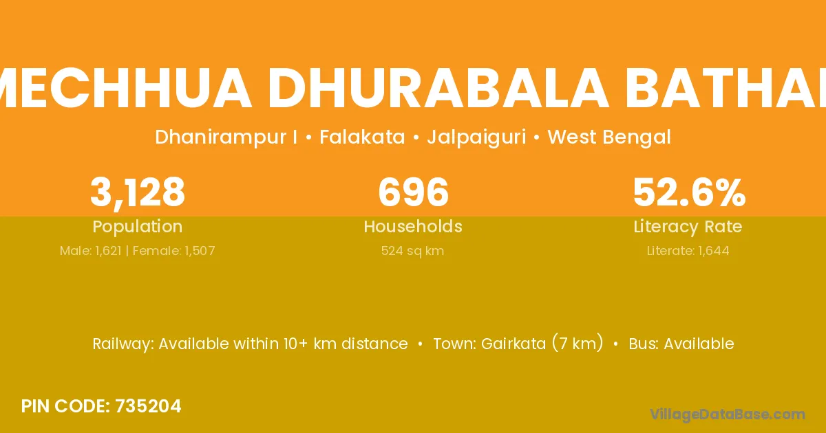 Mechhua Dhurabala Bathan village has a total population of 3,128 people, of which 1,621 are males and 1,507 are females.