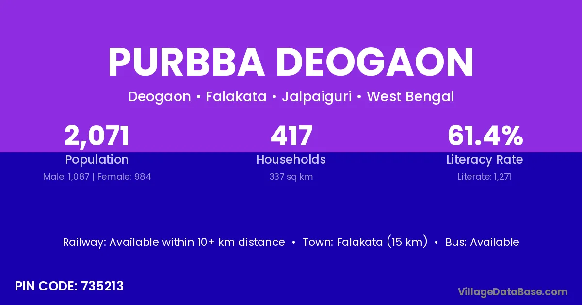 Falakata (15 km) is the nearest town to Purbba Deogaon village for major economic activities and is located approximately 15 km away.
