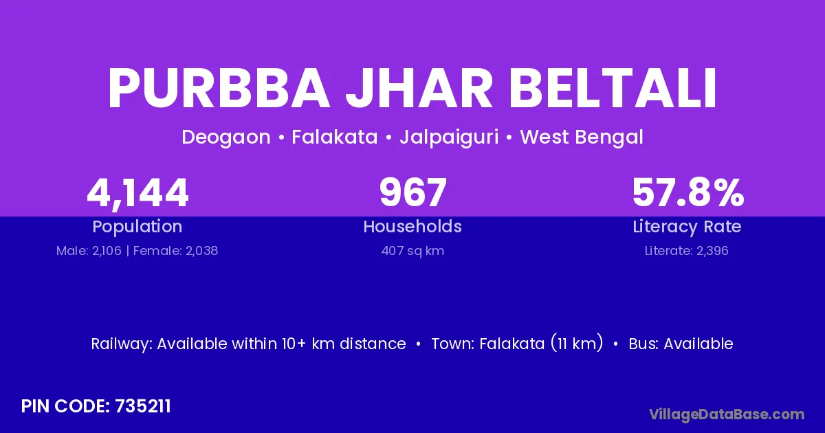 Purbba Jhar Beltali village has a total population of 4,144 people, of which 2,106 are males and 2,038 are females.