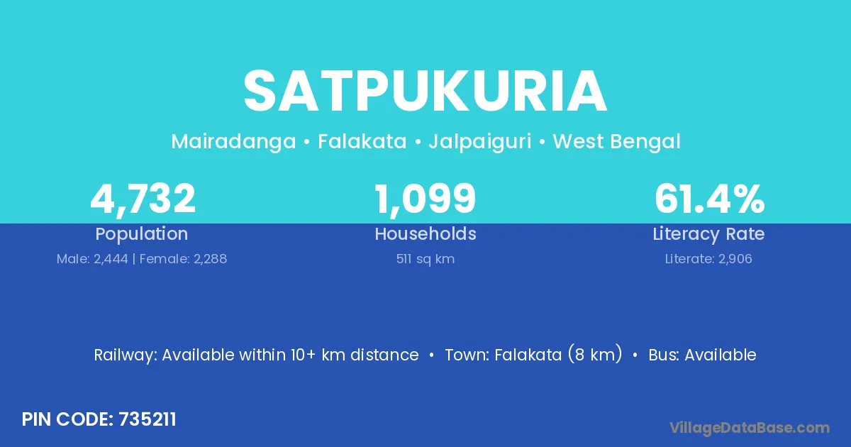 Falakata (8 km) is the nearest town to Satpukuria village for major economic activities and is located approximately 8 km away.