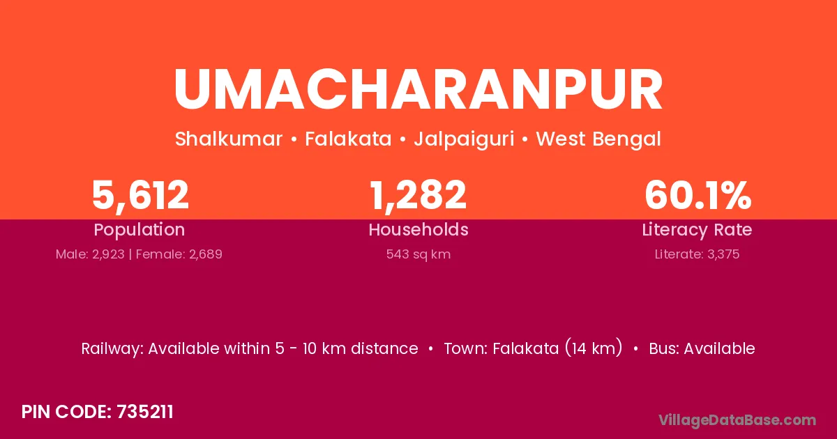 Falakata (14 km) is the nearest town to Umacharanpur village for major economic activities and is located approximately 14 km away.