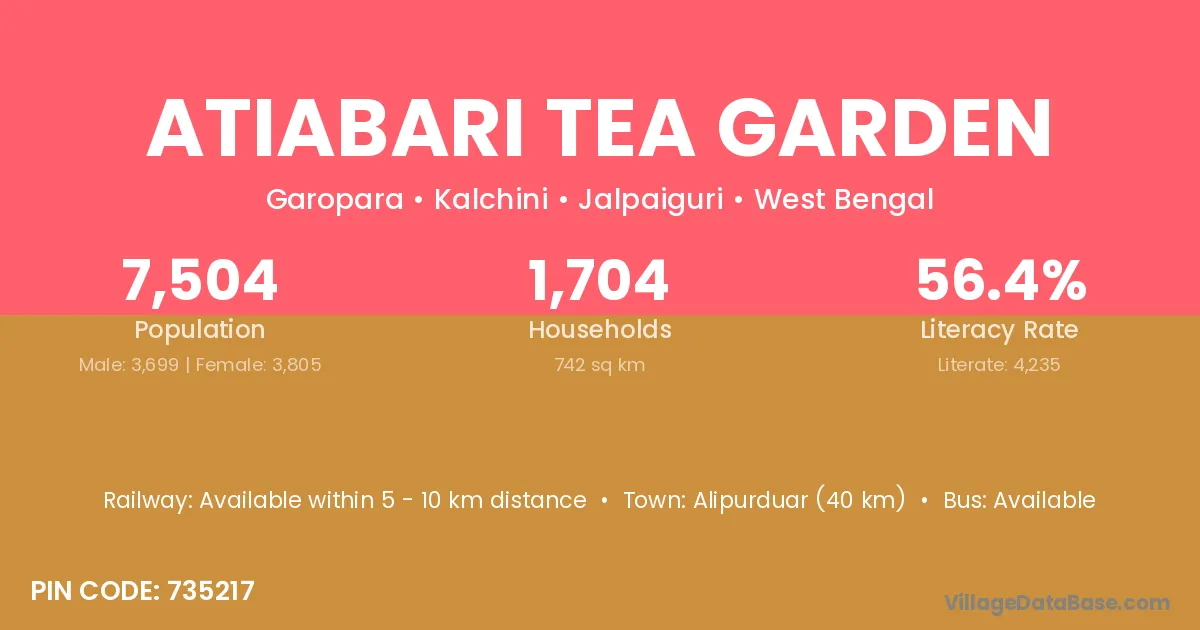 Atiabari Tea Garden village has a total population of 7,504 people, of which 3,699 are males and 3,805 are females.