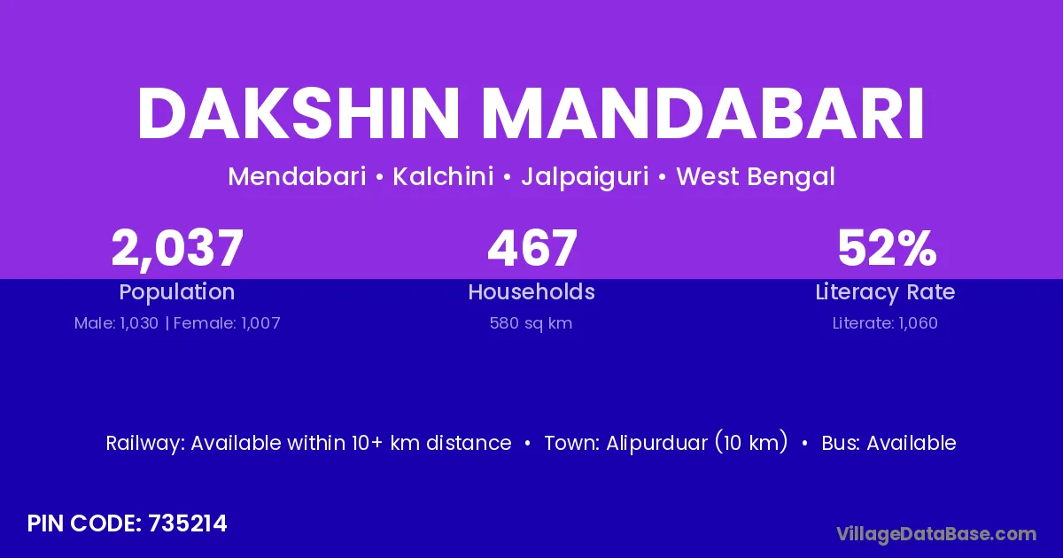 Dakshin Mandabari village has a total population of 2,037 people, of which 1,030 are males and 1,007 are females.