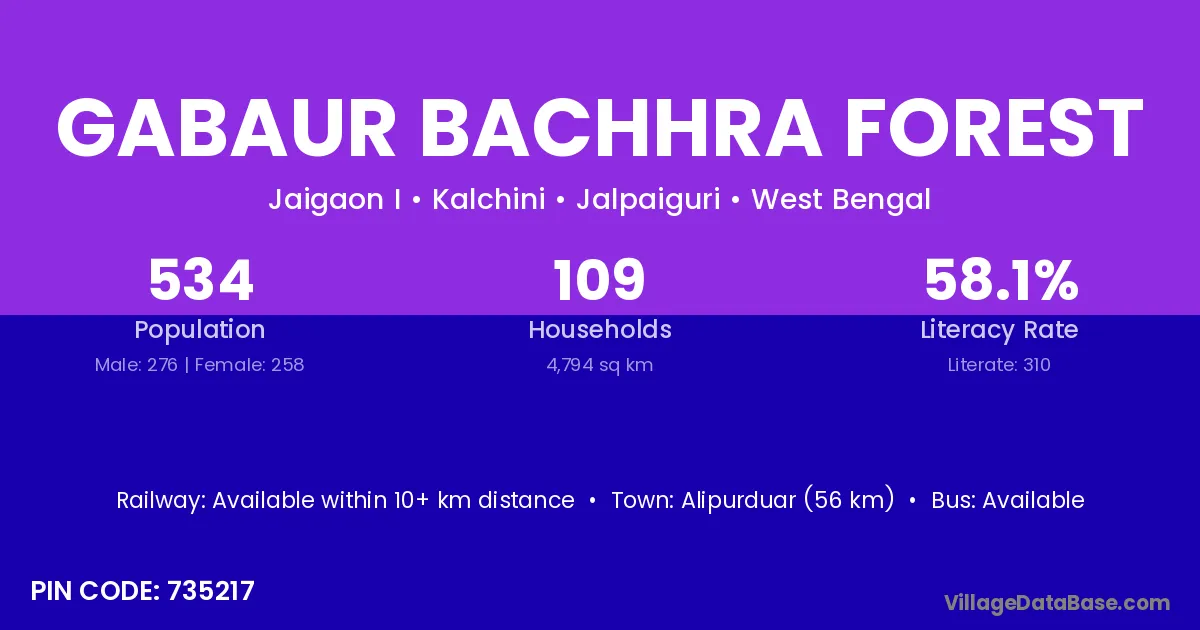 Alipurduar (56 km) is the nearest town to Gabaur Bachhra Forest village for major economic activities and is located approximately 56 km away.