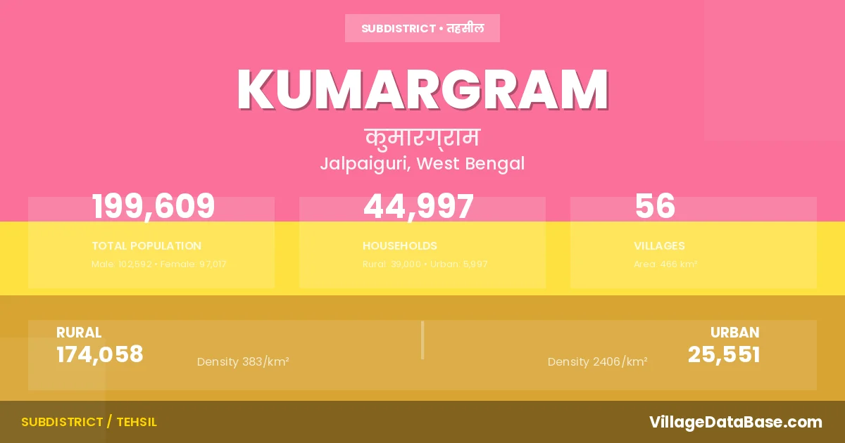 According to the 2011 census The total area of Kumargram Subdivision is 466 km², with a population of 199609 people. The population density is 429 inhabitants per square kilometre, and there are approximately 44997 houses in the sub district.