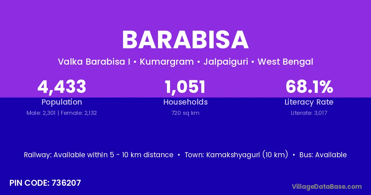 Kamakshyaguri (10 km) is the nearest town to Barabisa village for major economic activities and is located approximately 10 km away.