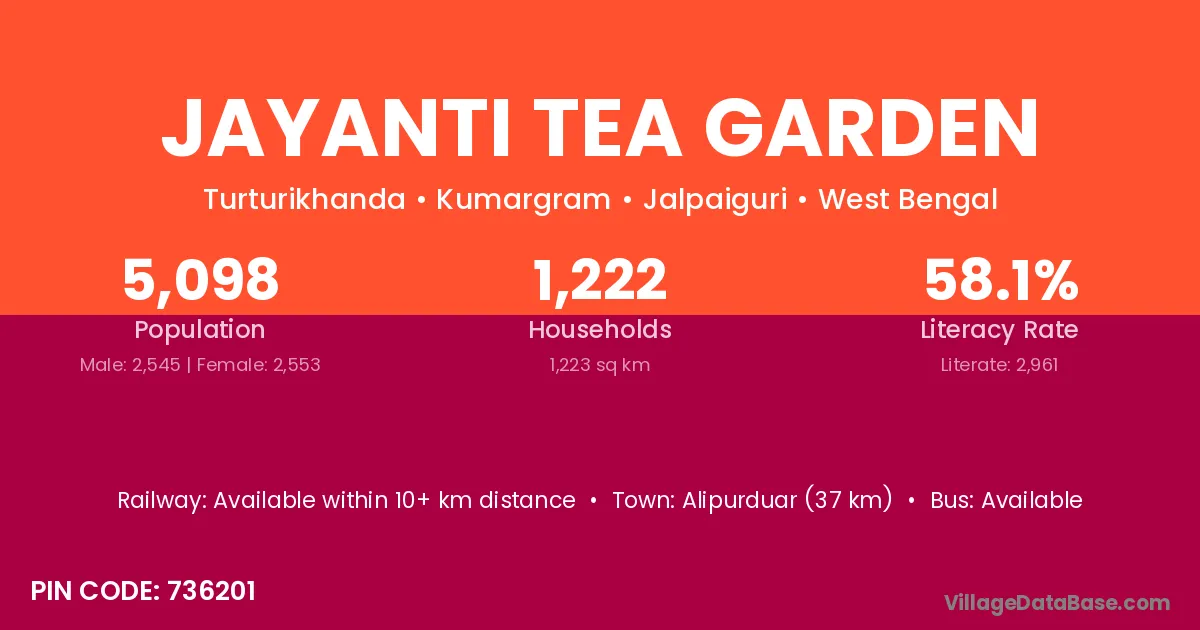 Jayanti Tea Garden village has a total population of 5,098 people, of which 2,545 are males and 2,553 are females.