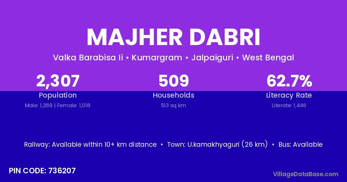 Majher Dabri village has a total population of 2,307 people, of which 1,289 are males and 1,018 are females.