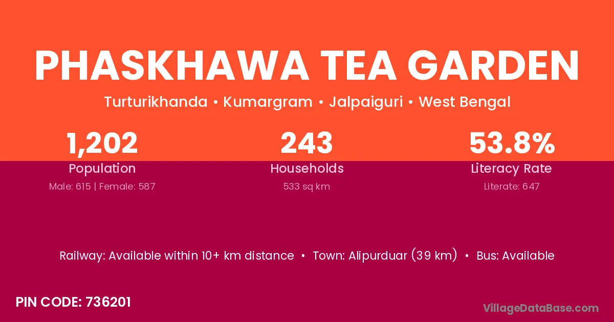 Phaskhawa Tea Garden village has a total population of 1,202 people, of which 615 are males and 587 are females.