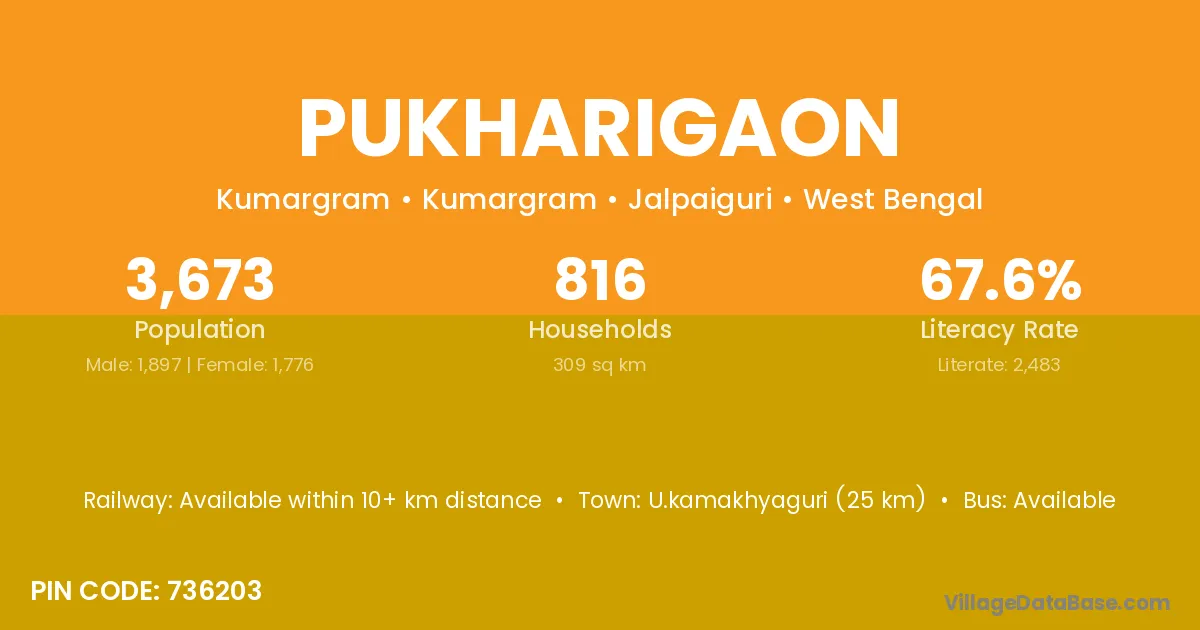 U.kamakhyaguri (25 km) is the nearest town to Pukharigaon village for major economic activities and is located approximately 25 km away.