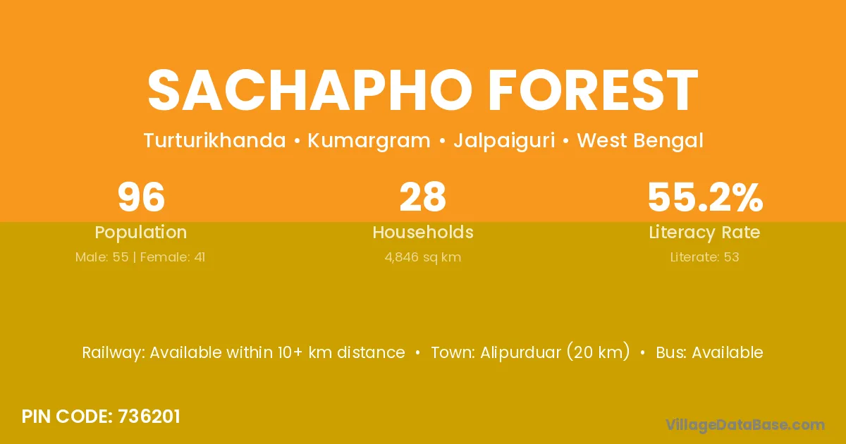 Alipurduar (20 km) is the nearest town to Sachapho Forest village for major economic activities and is located approximately 20 km away.